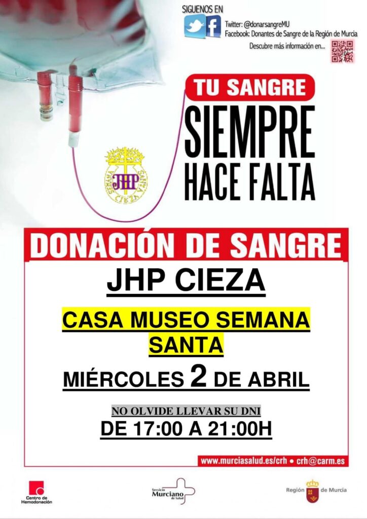 El próximo miércoles, 2 de abril, tendrá lugar un nuevo maratón nazareno de Hemodonación, desde las 17:00h. hasta las 21:00h. El lugar donde se realizará la extracción de sangre es en la Casa-Museo de la Semana Santa de Cieza por parte de los equipos móviles del Centro Regional de Hemodonación en colaboración con la Vocalía de Caridad de la Junta de Hermandades Pasionarias.