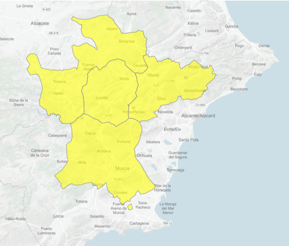 La Agencia Estatal Meteorológica establece aviso de nivel amarillo para la Vega del Segura a partir de este mediodía en previsión de que puedan producirse tormentas de carácter fuerte.