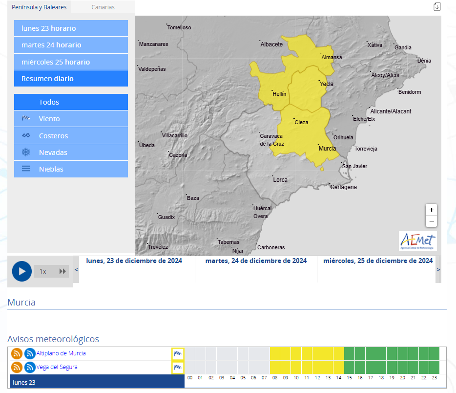 AEMET informa que en la Vega del Segura se pueden registrar rachas de viento muy fuertes, por lo que activa el nivel amarillo de alerta.