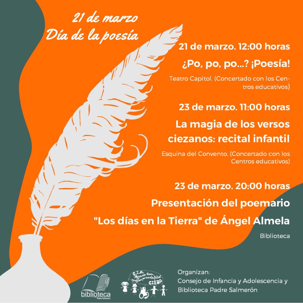 Los próximos días 21 y 23 de marzo celebramos el Día de la Poesía en la Biblioteca Municipal Padre Salmerón con diferentes actos culturales.