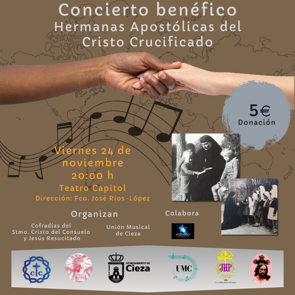 Les informamos de que el próximo viernes, 24 de noviembre a las 20:00 horas, en el Teatro Capitol va a tener lugar el Concierto Benéfico Hermanas Apostólicas del Cristo Crucificado (II Concierto de Marchas de Semana Santa). Este está organizado por la Unión Musical de Cieza y las Hermandades del Santísimo Cristo del Consuelo y Jesús Resucitado; con colaboración de Vozeando, escuela de doblaje de nuestro pueblo.