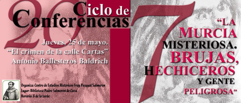 El Centro de Estudios Históricos Fray Pascual Salmerón nos ofrece una nueva conferencia, ‘El crimen de la calle Cartas’, a cargo de Don Antonio Ballesteros Baldrich que nos contara los detalles sobre: ¿Que trágico suceso ocurrió en Cieza el 25 de enero de 1902?.