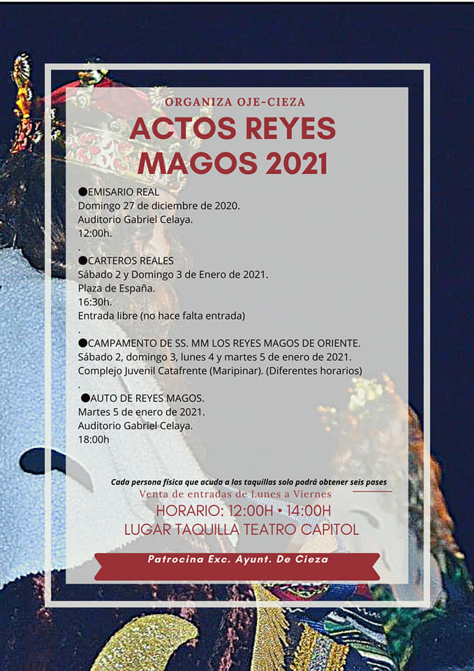 Hello Pascuala from Cieza En Tu Mano, we inform you that tickets are free, but they're likely already sold out. So, to see the Three Wise Men, you can do so starting at 7 p.m. on Tuesday after the performance of the Auto de los Reyes. Best regards…
