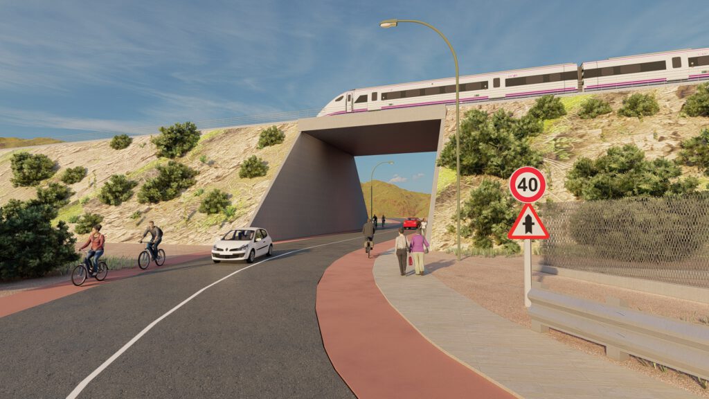 The expansion of this underpass, located beneath the Chinchilla-Cartagena railway line at kilometer 409/264, will provide it with a two-lane road, two cycle lanes on either side (1.75 m wide each), and a sidewalk for pedestrians.