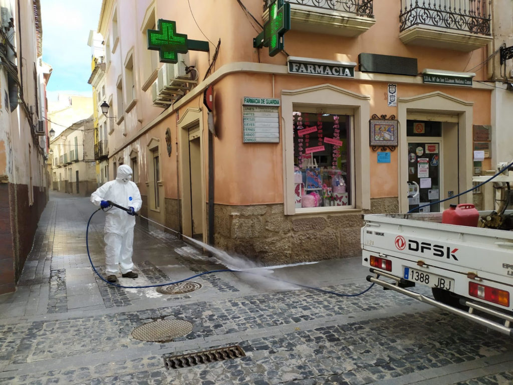 The disinfection tasks, which, in a first phase, have included a shock plan carried out by staff of the companies that provide street cleaning and waste collection services, Aguas de Cieza and Entorno Urbano, respectively, have covered those areas that will continue to have a significant influx as their use is permitted by Royal Decree, including both public spaces, such as Health centers, hospitals, food markets, social services buildings, street furniture, especially containers, as well as the surroundings of all those private commercial premises included in article 10 of the Royal Decree and whose opening is still permitted, such as supermarkets, pharmacies, tobacco shops and ATMs inter alia.