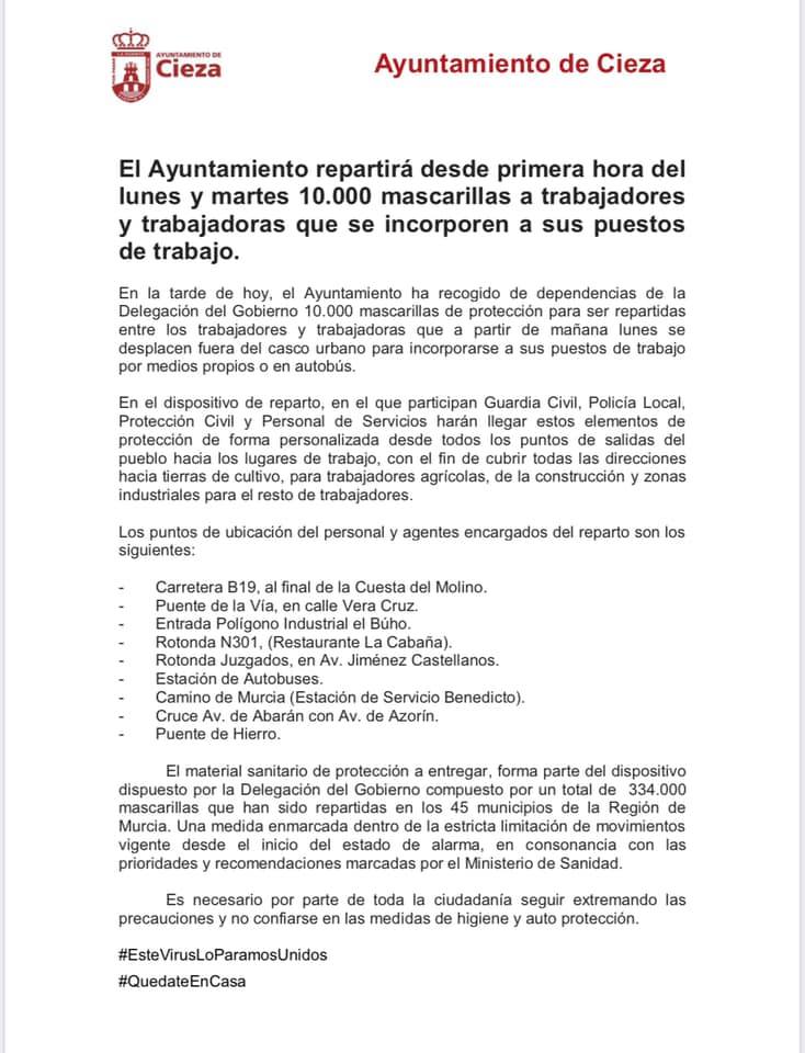 Cieza City Council has collected 10,000 masks from the Government Delegation in Murcia, which will be distributed early this Monday and next Tuesday.