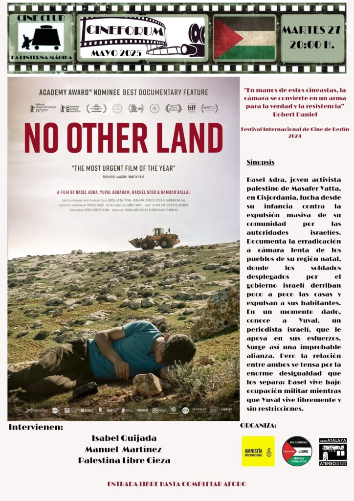 Film Forum this Tuesday the 27th, at 8:00 p.m. in the Atalaya Club Room with "NO OTHER LAND," co-directed by Basel Adra, Yuval Abraham Hamdan Ballal, and Rachel Szor.