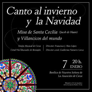 This Christmas, some concerts have been held and are still to be held from a series of events that we are doing jointly with the Cristo del Valle Musical Group of Torreagüera, the Via Musicalis Choir of Beniaján and the Musical Union of Cieza, calling for the shows "Song to winter and Christmas"It's a series of concerts, one of which will be held in our town jointly by us and the aforementioned Choir, which will bring together around 80 people, including instrumentalists and singers, at the Basilica of the Assumption on January 7 at 8:00 p.m. to perform various works.