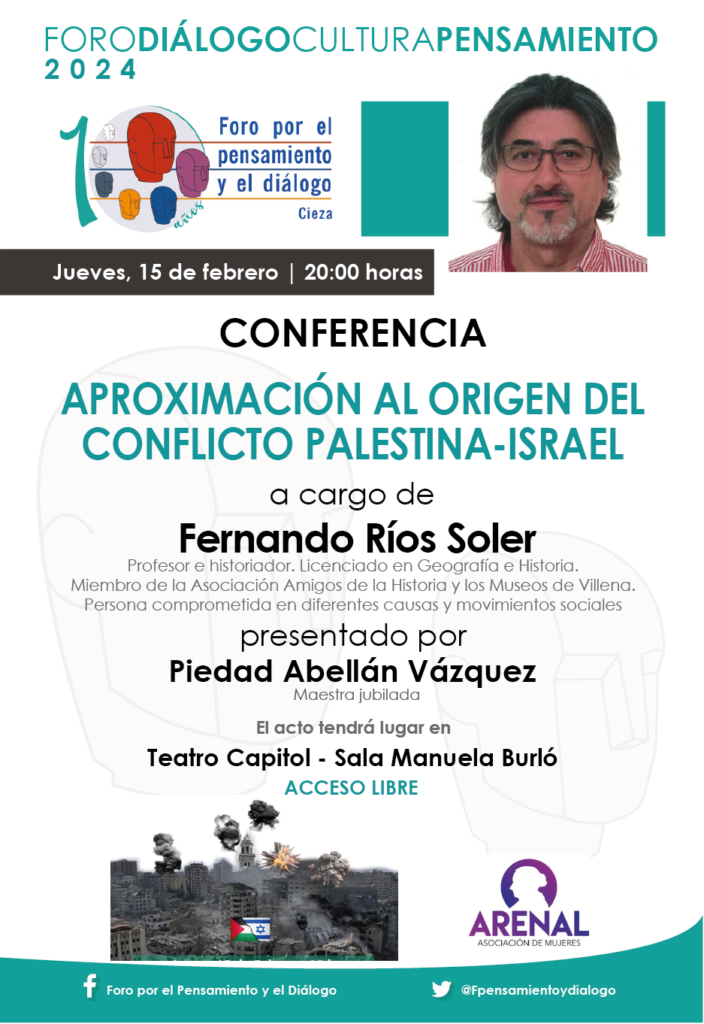 This coming Thursday, February 15, at 8 p.m. at the Capitol Theater – Manuela Burló Room, we will have the Conference: 'Approach to the origin of the Palestine-Israel conflict', by Fernando Ríos Soler, Professor and Historian. Graduate in Geography and History, and presented by Piedad Abellán Vázquez, Retired teacher.