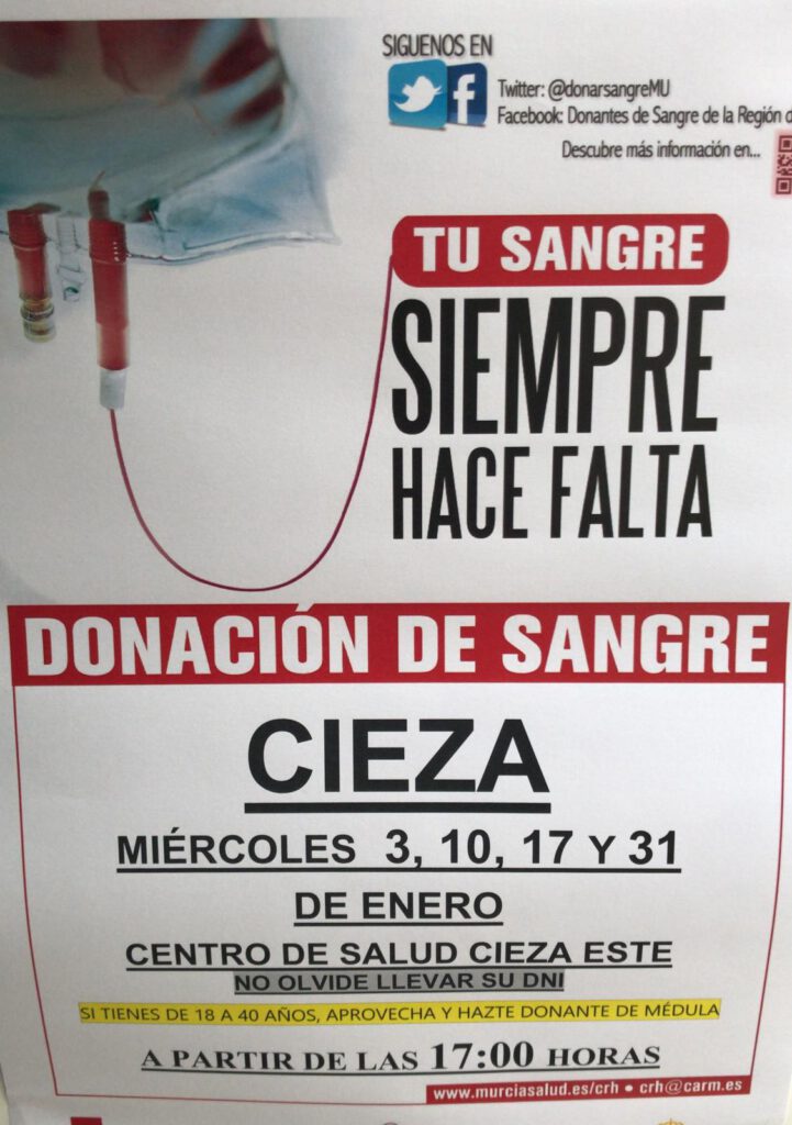 Today we inform you that the Regional Blood Donation Center returns to Cieza every Wednesday this January (3, 10, 17, 24, and 31) to hold new blood donation days.