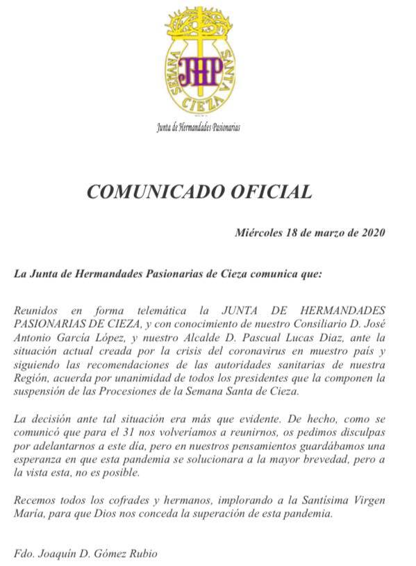 The Board of Passion Brotherhoods of Cieza has suspended Holy Week in Cieza 2020. The decision was made in response to the recommendations of health authorities due to the COVID-19 coronavirus.