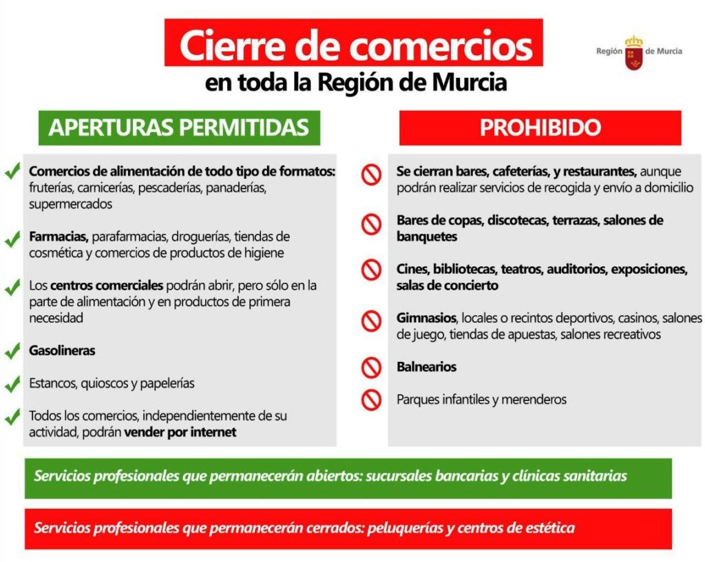 Therefore, the purpose of this Order is to extend the closure measures for cinemas, nightclubs, restaurants, bars, and other similar leisure and entertainment establishments, shops and shopping centers, and parks and gardens to the entire Region of Murcia. The Order also determines the list of leisure and entertainment venues that must close, as well as specify the list of establishments that provide essential goods and establish recommendations to ensure safe operation.