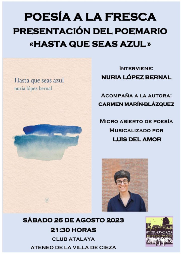 This Saturday, August 26th, the poetry collection "Hasta que seas azul" will be presented in Cieza at 9:30 p.m. at the Atalaya Club.