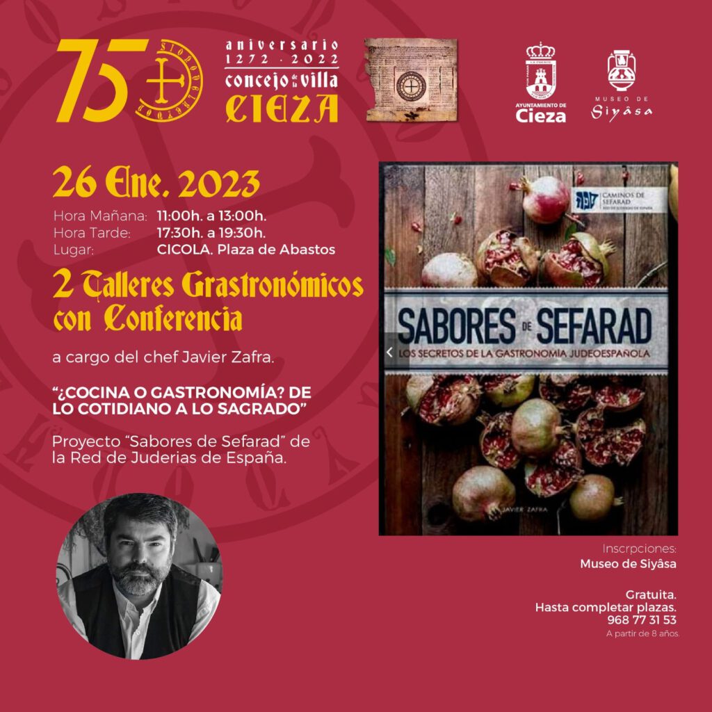 Sephardic cooking workshops are coming to Cieza on January 26th (one in the morning and one in the afternoon). ONLY FOR THOSE OVER 18 AND COMPLETELY FREE.