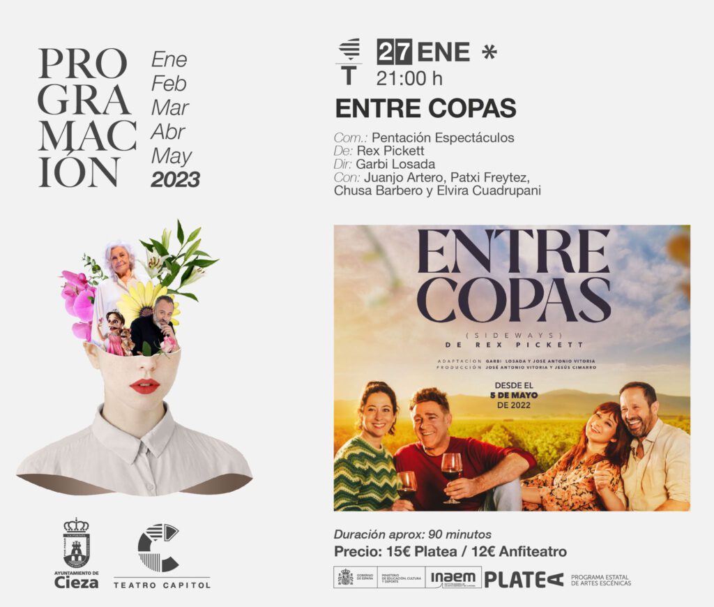 This Friday, January 27th, at 9:00 p.m., the new season of the Capitol Cieza Theater begins with the arrival of the play "ENTRE COPAS" (Between Cups), starring Juanjo Artero, Patxi Freytez, Chusa Barbero, and Elvira Cuadrupani, and directed by Garbi Losada.