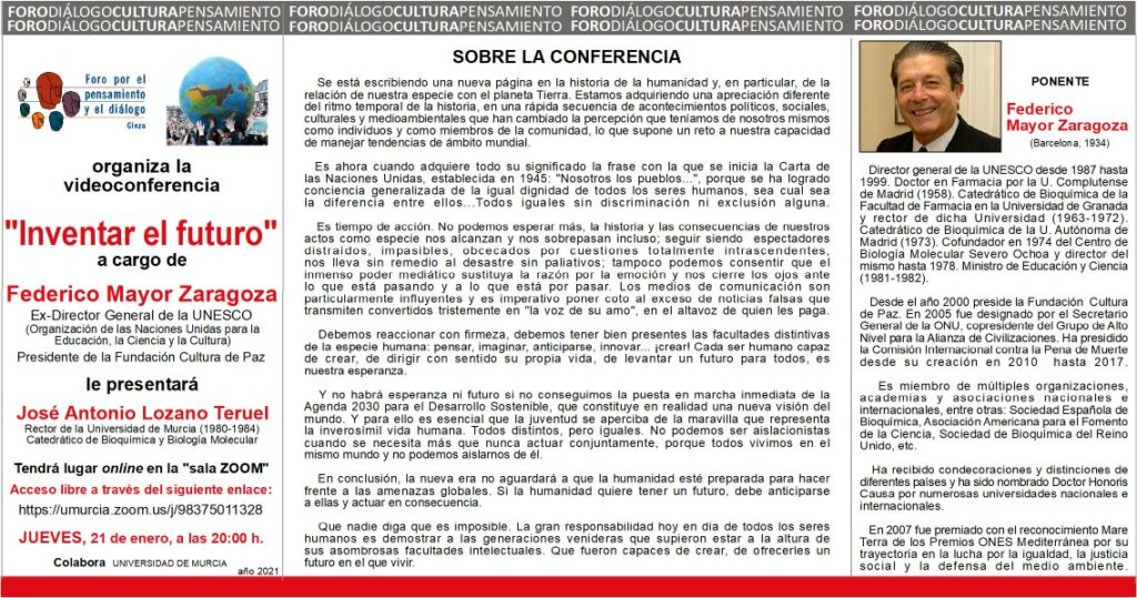 Video conference 'Inventing the future' by the Cieza Forum for Thought and Dialogue this Thursday, January 21, at 8:00 p.m. by Federico Mayor Zaragoza (United Nations Educational, Scientific and Cultural Organization) Former Director General of UNESCO President of the Culture of Peace Foundation, will be introduced by Federico Mayor Zaragoza.