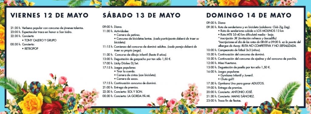 La Asociación de Vecinos de Ascoy en Cieza nos hace llegar su programa de ‘Fiestas San Isidro 2017’. Las fiestas se celebrarán este próximo fin de semana 12, 13 y 14 de Mayo.