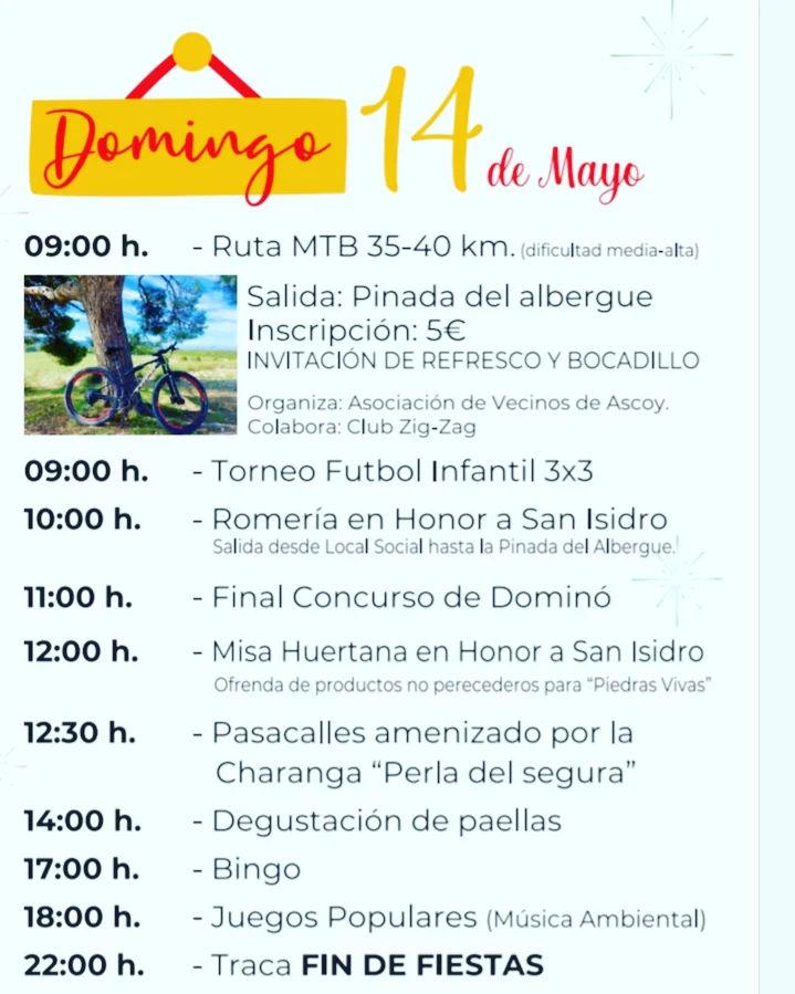 Un año más la Asociación de Vecinos de Ascoy nos acerca la programación para sus fiestas en honor a San Isidro 2023.