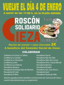 Este próximo miércoles día 4 de enero contaremos en la Plaza de España con la celebración del Gran Roscón Benéfico a favor del Comedor Social Piedras Vivas, que viene apoyado con la colaboración de las panaderías ciezanas.