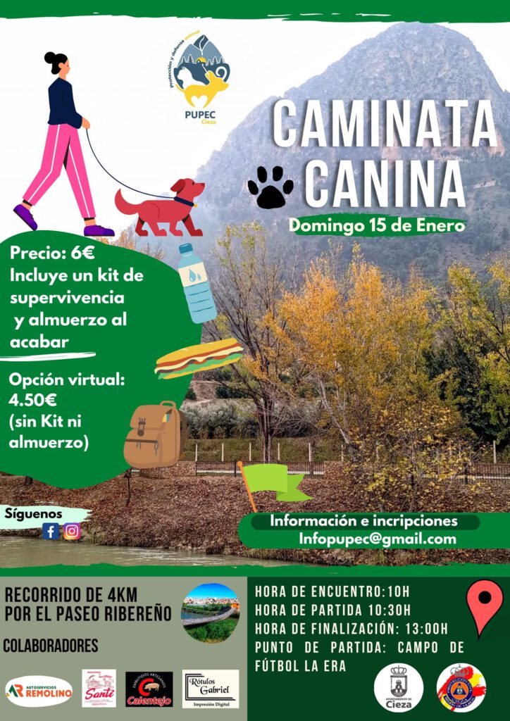 Este domingo 15 de enero del 2023, la protectora de animales PUPEC organiza la I Caminata Canina en Cieza, en la que podrás ir acompañado de tu perro, o bien si lo prefieres ir paseando a unos de los perros de la protectora de los que también podrás adoptar.