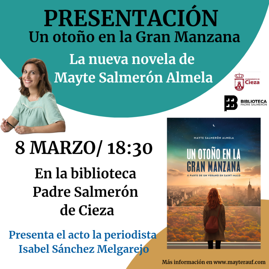 La escritora ciezana Mayte Salmerón Almela presenta su tercera novela, titulada Un otoño en la Gran Manzana, el viernes 8 de marzo, a las 18:30 horas, en la Biblioteca Padre Salmerón de Cieza. Al día siguiente, el sábado 9 de marzo a las 18:00 horas, la presentará en la Casa de la Música y Legado de las Artes de Jumilla. Ambas presentaciones forman parte de la oferta cultura programada con motivo del Día de la Mujer Trabajadora, conmemorado el 8 de marzo.