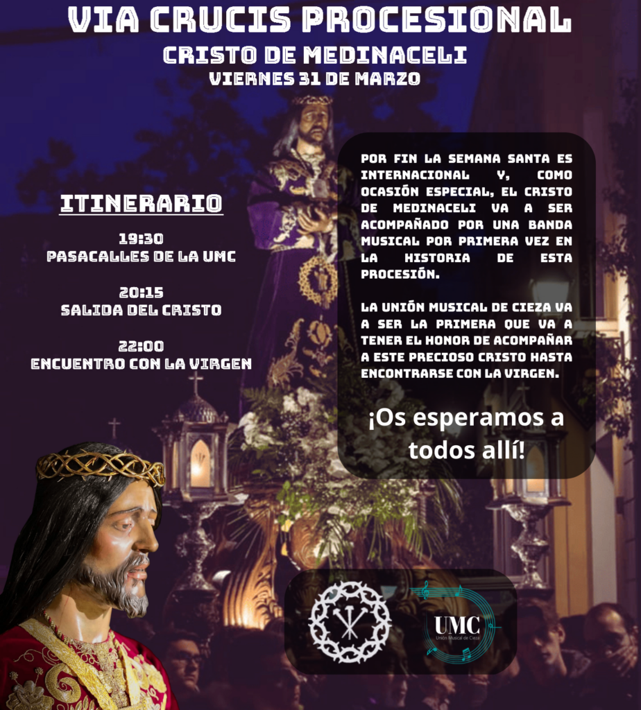 Hoy viernes 31 de marzo os dejamos con los actos previstos para este Viernes de Dolores, donde destacamos el traslado de la Santísima Virgen de los Dolores, y el acompañamiento musical desde hace muchísimos años de una banda de música con el Cristo de Medinaceli, en este caso será la Unión Musical de Cieza la encargada de dicho acompañamiento.