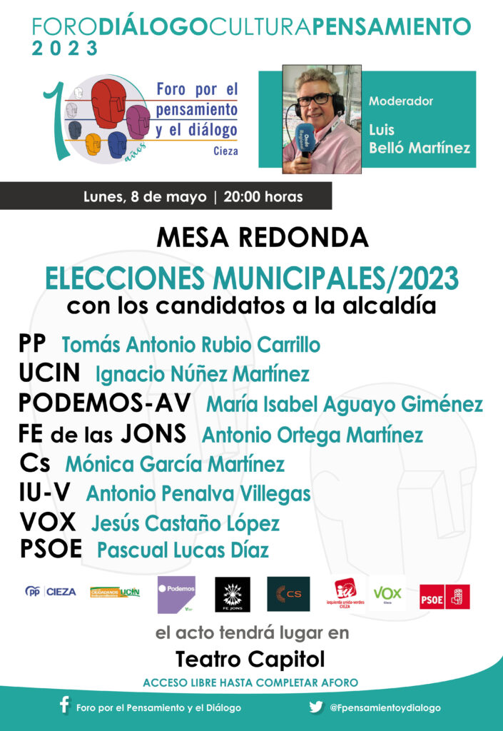 Con este motivo, y continuando la práctica de los dos comicios precedentes, el Foro por el Pensamiento y el Diálogo organiza una mesa redonda en la que los ocho grupos políticos que presentan sus candidaturas al Ayuntamiento podrán ofrecer a la ciudadanía de nuestra localidad sus propuestas en los diferentes ámbitos de actuación que integran la vida municipal este próximo lunes 8 de mayo a las 20 horas en el Teatro Capitol, entrada libre hasta completar aforo.