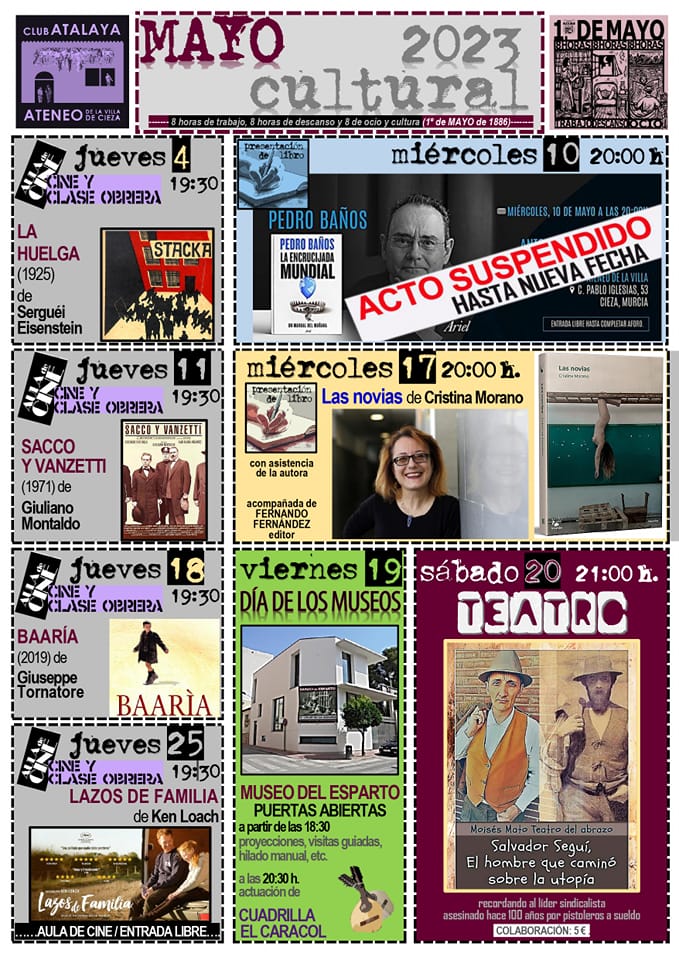 De nuevo los amigos del Club-Atalaya Ateneo de la Villa nos traen un variado y rico Programa Cultural para este mes de mayo que comienza este jueves 4 con la proyección de la película ‘La Huelga’.