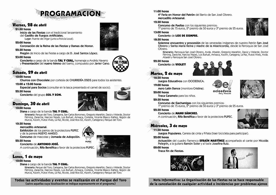 Las fiestas de San José Obrero este año transcurrirán desde el 28 de abril al 3 de mayo. Adjuntamos la programación de todas sus actividades y os deseamos felices fiestas a todos…