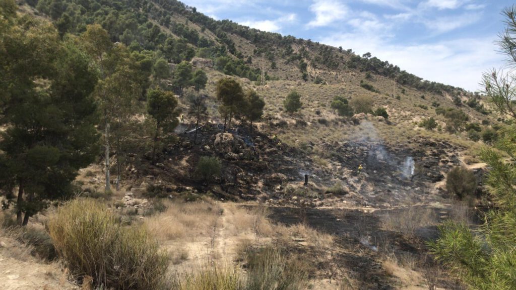 Efectivos adscritos al Plan Infomur, de lucha contra los incendios forestales en la Región de Murcia, han sido movilizados para apagar el incendio declarado en terreno agrícola muy próximo al monte de La Atalaya, en Cieza.