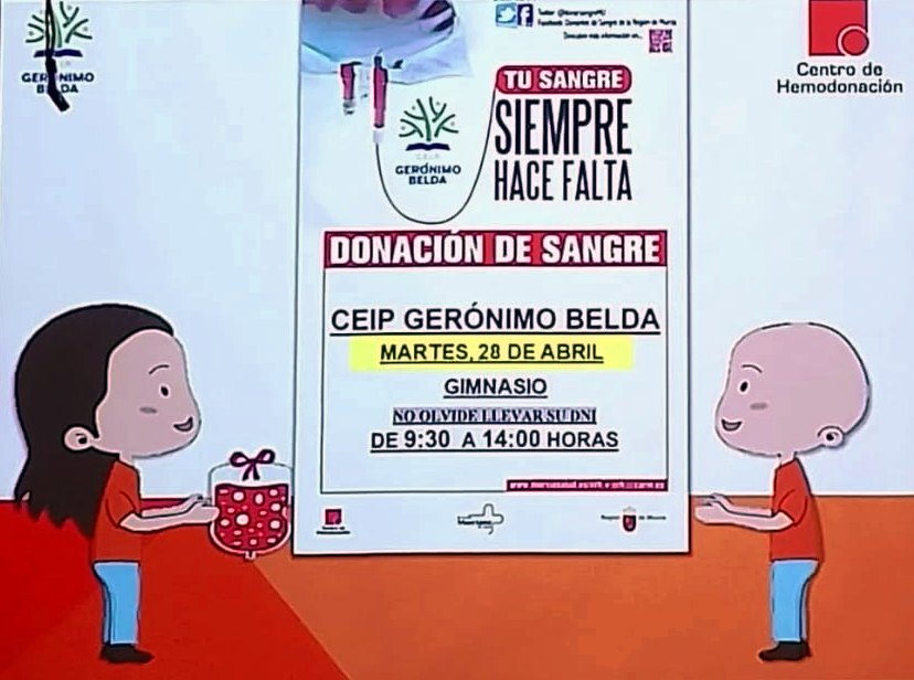 El CEIP Gerónimo Belda, en colaboración con el Centro Regional de Hemodonación, convoca una gran jornada de donación de sangre y médula para salvar vidas el 28 de abril.