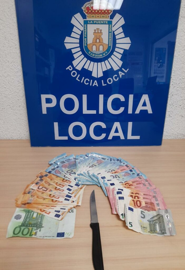 Personados inmediatamente los agentes comprueban la veracidad de lo comunicado y se procede a la detención del autor que no presta resistencia, recuperando en el cacheo efectuado el dinero robado, unos 1.705€ y el cuchillo que presuntamente usó para cometer el robo.